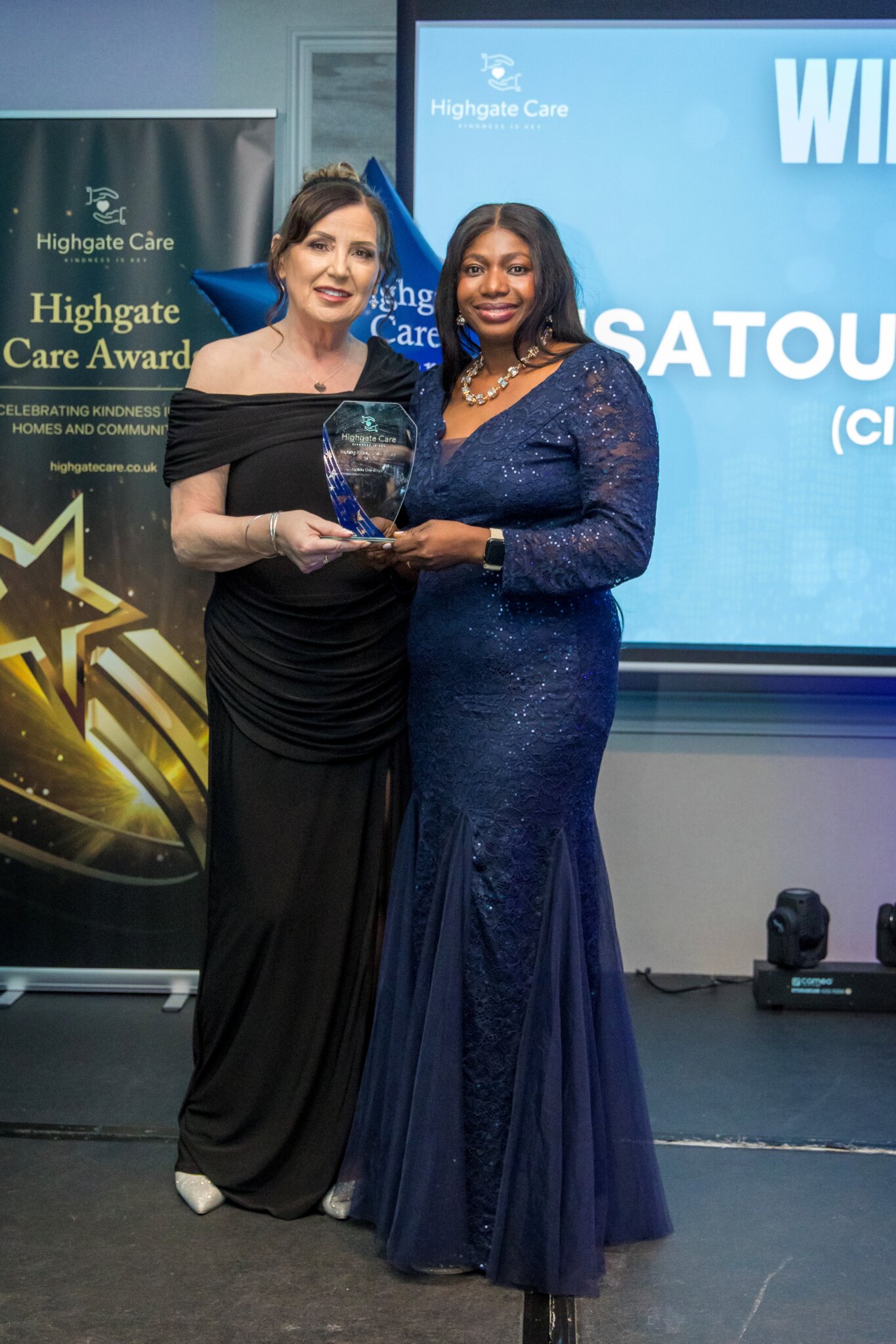 A particularly moving moment of the evening came with the presentation of the Inspirational Leader Award. Joanne Fogg herself was honoured with this special recognition. The award was presented by Andrew Harrison-Ireland, Care Home Manager at Alpine Lodge Care Home, alongside Highgate Care Recruitment Manager Martine Woodhouse.